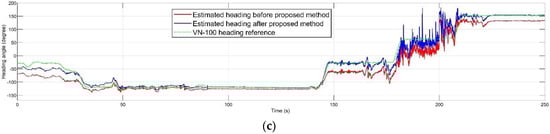 Estimated orientation before and after performing the propsed method compared to the true reference orientation: (a) roll; (b) pitch; (c) heading.