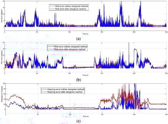 Absolute error before and after performing the proposed filter: (a) roll; (b) pitch; (c) heading.