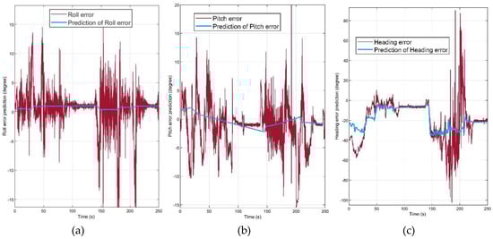 (a) Roll error and roll error prediction signal; (b) pitch error and pitch error prediction signal; (c) heading error and heading error prediction signal.