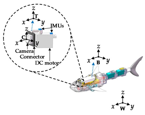 The shark-like robotic fish was developed in our previous work [16]. It is 483 mm long, 208 mm wide, and 125 mm high. For the sake of clarity, the components of the 1-DOF visual sensor stabilization platform is illustrated in Figure 2, and the visual sensor used in this study is the monocular camera. Specifically, the four coordinate systems are defined, whereby frames T and C fixed on the camera are related to the desired camera attitude and the current camera attitude, respectively. The body frame B is fastened at the center of gravity of the fish and corresponds to the attitude of the shark-like robotic fish. The world frame W is consistent with the initial body attitude. Then, the problem can be simplified as