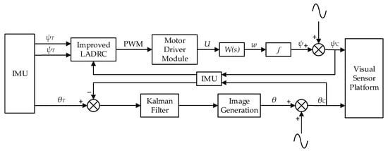 The visual system framework of a 1-DOF visual sensor stabilization platform is depicted in Figure 4. Specifically, it is updated with an improved LADRC utilizing the total disturbance estimated by linear extended state observer (LESO) to compensate in the yaw direction, and coupled with a rapid digital stabilization algorithm to stabilize the roll direction. Considering the limited head space of the robotic shark, the angle of the vision sensor is collected by IMU instead of a laser diode [26].