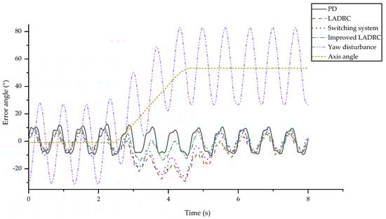 Experimental results of proportion differential (PD) control, LADRC, switching system, improved LADRC, yaw disturbance, and axis angle under the yaw sine wave disturbance with frequency of 1.5 Hz and amplitude of 30°, the roll sine wave disturbance with a frequency of 1.5 Hz an amplitude of 10°, and a turning speed of 25°/s.