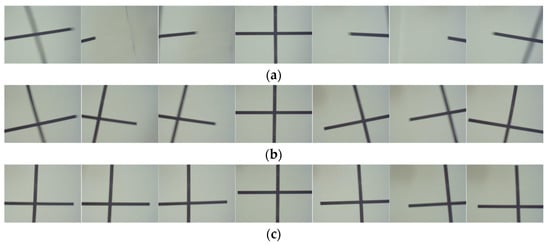One cycle image sequence was selected to compare the results for the three cases: no stabilization, mechanical stabilization, and the combination of mechanical stabilization and digital stabilization, which are depicted in Figure 7. The periodic motion lasted for 0.67 seconds at a frequency of 1.5 Hz. The symbol of the cross shape was 0.015 m in front of the camera. The resolution of the camera was 1920 × 1080 pixels. To avoid shadows after motion compensation, the image was cropped from the center to 800 × 600 pixels. The middle picture shows the initial position, the left and right sides were moving to the left and right of this, respectively.