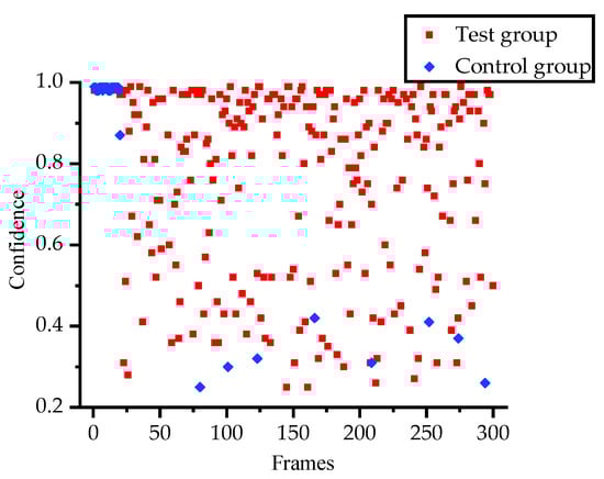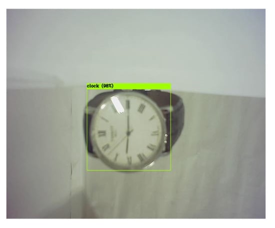 With regard to the ultimate goal of the visual sensor stabilization of the platform, the effectiveness of the visual sensor stabilization system in target recognition during a part of the process was verified. First, the system without any stabilization methods was used as a control group, while the stabilization system constructed in this paper served as a test group. Secondly, the YOLOv3-tiny algorithm was used based on the frame rate of the current camera, which was 30 fps although this might be higher in the future [39]. It worked with excellent speed, and was able to meet the requirements. The identification object was the clock, which was in the COCO database [40]. Finally, the experimental layout is illustrated in Figure 8, in conjunction with the confidence contrast scatter diagram as shown in Figure 9. The recognition process only exhibited objects detected with a confidence of 0.25 or higher, and the processing time was 10 s.