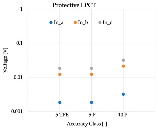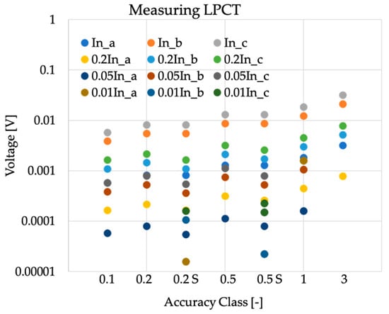 In Figure 2 the absolute values of were graphed starting from the rated outputs listed in Table 1 (referred to in the graphs as (a), (b), and (c)). The graph contains all the values associated with Table 3 by adopting a logarithmic scale, which better highlights the range of values assumed by . It is clearly emphasized from the graph that, regardless from the accuracy class observed, the maximum allowed contribution of noise and direct component was of few millivolts (remember that we used a ). Such limits are more stringent as the testing current decreases, and overall, they are very difficult to maintain compliance with in practical situations.