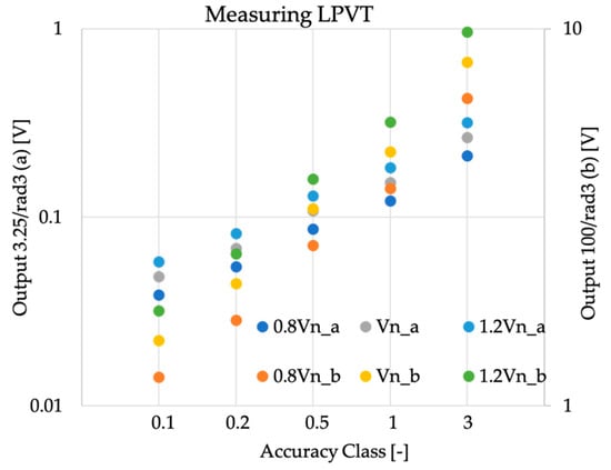 Turning to voltage transformers, numbers drastically changed due to the adopted testing levels and fixed rated outputs. In fact, absolute values obtained for the rated output varied from 1 V to 10 V, hence far greater than a typical instrument noise level of direct component. However, even for the other rated output, , the limits imposed by ranged from 50 V to 300 mV, which are reasonable values easily met by off-the-shelf instrumentation. The comments can be confirmed looking at Figure 4.