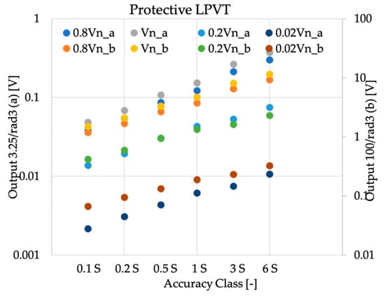 Finally, the situation slightly degraded for protective purpose voltage transformers, as it can be seen in Figure 5. The fact is simply due to the variation of the testing levels and ratio error limits (as presented in Table 6). However, even for the smallest voltage level, the allowed noise and direct components contribution was of few millivolts.