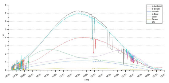 Figure 1 shows the six directional UVR data collected from 8:30 a.m. to 5:30 p.m. on 25 February 2020 in College Station, Texas. Table 4 shows descriptive statistics of the UVR values. The daily minimum UVR values for the six-directional UVR data are 0. Daily maximum ambient UVR was 7.31 UVI (182.75 mW/m2) at 12:33 p.m., similar to that of the tripod-mounted sensor facing up (6.96 UVI, 174 mW/m2). More than half of the UVR came from the southern sky (53.9% of the maximum ambient amount and 58.7% of the mean ambient amount), especially at noontime when the ambient UVR reached its peak value. UVR from the eastern sky reached its peak value in the morning at 10:33 a.m. (3.14 UVI, 78.5 mW/m2), while the peak value of the western sky was reached in the afternoon at 3:30 p.m. (2.28 UVI, 57 mW/m2). At 9:00 a.m. and 4:00 p.m., the amount of UVR from the eastern and western skies were almost the same amount from overhead. The average ratio of each direction to the ambient UVR was 1.01 for up, 0.56 for south, 0.41 for east, 0.30 for west, 0.21 for north, and 0.07 for down.