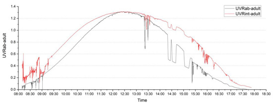 The relationship between the two approaches of estimating individual UVR for adults was compared using estimated ER and the ambient irradiance UVR data (), as well as integral calculation of UVR data from six directions () (Figure 2). The cSZA on 25 February 2020 was calculated according to the NOAA online solar position calculator every six minutes [45]. The maximum for an adult was 1.32 UVI (33 mW/m2), and was 1.31 UVI (32.75 mW/m2). The daytime, eight-hour (8:30 a.m. to 5:30 p.m.) maximum erythemal dose was 2.3 MED (555 J/m2) based on and 3.5 MED (707 J/m2) based on the results for adults. Daily cumulative UVR data based on was higher than , but not significant at p < 0.01. The shape of was steeper and more like the environmental UVR curve in Figure 1. The multi-directional measurements seemed to have a ‘smoothing’ effect on the curve. In morning and afternoon times, values of were higher than due to the influence of side directional UVR on the value.