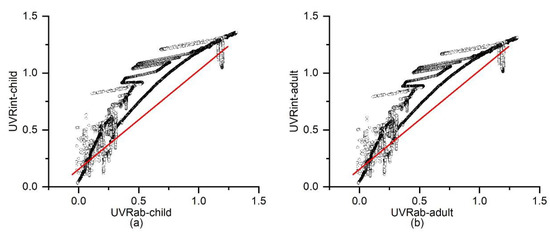 (a) Correlation between UVRab and UVRint for children, (b) UVRab and UVRint for adults. The red line illustrates the linear fitted line.