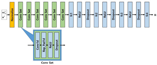 is an angular rate that is the output of gyro, is a linear acceleration that is an output of accelerometer, and Conv Set is composed of Conv1d representing one-dimensional convolution layer, Rep_Pad1d, which creates one-dimensional padding by copying the boundary values, ReLU activation function, and Dropout layer.