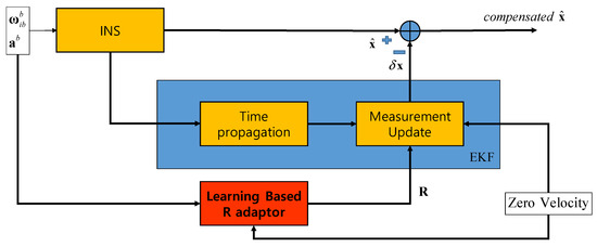 Figure 3 shows the case of using a fixed error covariance R. INS uses the acceleration and angular velocity to calculate the navigation solutions. The EKF module located in the middle consists of the time propagation and measurement update process. The measurement update process is performed by applying the zero-velocity measurement and the fixed R value indicated in the red box. The compensated is obtained by subtracting the estimated error state from EKF to the navigation solution from INS.