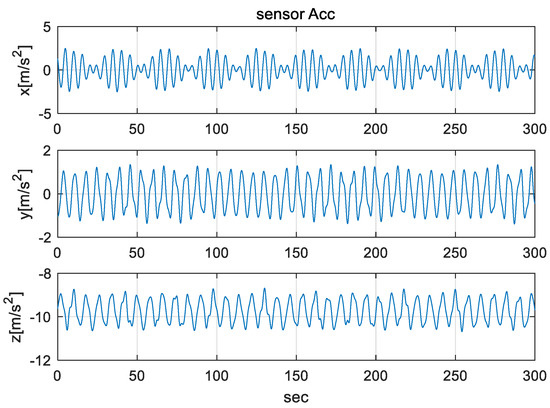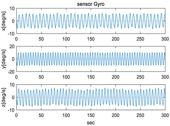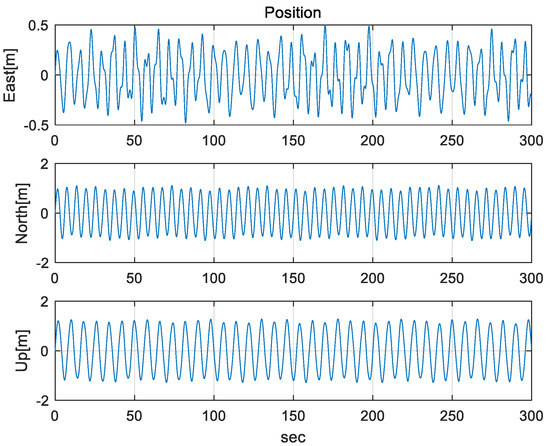 The IMU sensors (gyros and accelerometers), initial navigation error, and parameters used in the simulation are shown in Table 3. To simulate the mooring environment, reference values for position, velocity, and attitude were generated using the parameter values defined in Table 3 and Equations (31)–(33). Figure 6 shows the position of a vehicle in the mooring condition. Figure 7 and Figure 8 show the reference position and attitude generated under mooring conditions. Figure 9 and Figure 10 show the true output of the gyro sensors and accelerometers sensors generated under mooring conditions.