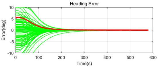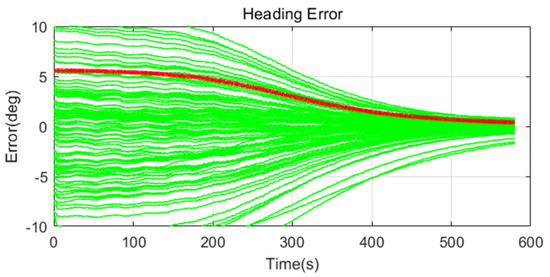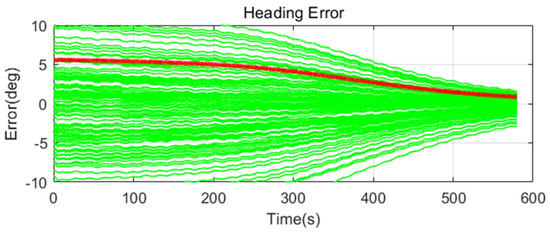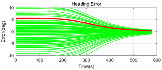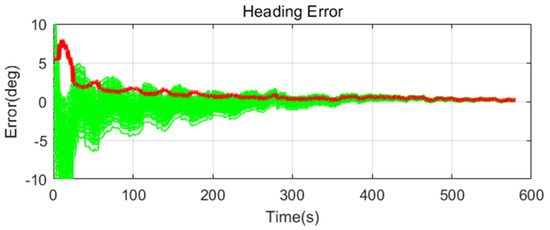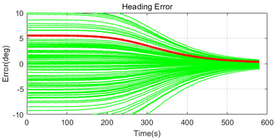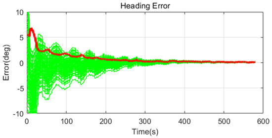 Simulation results are shown in Figure 11, Figure 12, Figure 13, Figure 14, Figure 15, Figure 16, Figure 17, Figure 18 and Figure 19 and Table 4, Table 5, Table 6, Table 7, Table 8 and Table 9. In the figures, the green lines show the results of 100 evolutions of Monte Carlo simulations with randomly set initial values. The red line is the RMS value of the result of 100 evolutions. Table 4, Table 6, and Table 8 show the RMS value of the error during the entire time for each case. Table 5, Table 7, and Table 9 show the RMS value of the last error for each case. In Table 4, Table 6, and Table 8, the times of convergence is defined as the time when the heading error (RMS) is within 20% of the initial heading error.