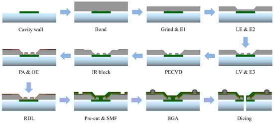 The process flow of the CIS-WLCSP structure is shown in Figure 3. Firstly, a 40 μm height CV dam was built in the corresponding non-sensor area of the chip on a 12-inch anti-reflection glass wafer by photolithography, depicted by the “Cavity wall” in Figure 3. The material used in the CV process is the same with SMF. Then, the glass wafer was bonded with CIS wafer permanently through polymer glue by a wafer to wafer bonding process, depicted by “Bond” in Figure 3. After bonding, the CIS wafer was grinded mechanically to 160 μm and then thinned to 150 μm by dry etching for stress release, depicted by “Grind & E1” in Figure 3. The trenches-tapered TSV structures are formed by two steps of lithography (Litho trench, LE and Litho via, LV) and isotropic reactive ion etching (Etch 2, E2 and Etch 3, E3). The silicon trenches upon the chip scribe lines were etched firstly, shown by “LE & E2” in Figure 3, and following, tapered TSVs were fabricated on the positions of chip pads, shown by “LV & E3” in Figure 3. The silicon dioxide was deposited by PECVD as the first insulation layer, depicted by “PECVD” in Figure 3. For the strict temperature control of the CIS product, the deposition temperature was set to 180 °C. To solve the ghost image issue, a layer of 1.5 μm Al was sputtered on the wafer as a metal shielding layer called the IR block. Lithography and wet etching were used to remove redundant Al, shown by “IR block” in Figure 3. Next, the second passivation layer (PA) was made by spray coating only the developed areas of the via bottom where they are later exposed for oxide dry etch (OE) for electrical connection, shown by “PA & OE” in Figure 3.