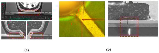 Package failure modes after TC test. (a) Pad delamination in the bottom of the TSV; (b) RDL crack near the UBM neck.