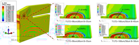 Figure 6 shows the S33 stress (stress along Z-axis direction vertical to the pad) distribution. The max value in the pad center is listed in Table 2. The max stresses for Si_T1/Si_T2 were 90/60 μm and for 100/50 μm they were 71.8 Mpa and 70.2 Mpa, which means the silicon ratio had little effect on S33 stress, while the S33 stress increased linearly as the opening diameter of via increased, presented in Table 2. With a 5 μm addition in size, the stress increased by about 7%. This was caused by SMF accumulation in via. The CTE of SMF was as high as 58 ppm/°C and when SMF shrunk with the temperature decrease, it would drag the pad up. Considering the simulation results and process capability, the structural parameters of Si_T1/ Si_T2 and via opening set as 100 μm/50 μm and 50 μm, respectively, were adopted in real structure design.