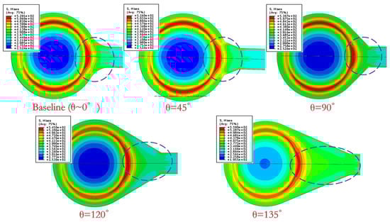 Figure 8 depicts the stress distribution of the RDL for different designs in the first cycle of the TC test. The simulation and corresponding DOE experiment results are listed in Table 3. As shown in Figure 8, the neck of UBM suffered a high von Mises stress. By increasing θ, the distance between the neck and the UBM increased, and the max von Mises stress decreased linearly. The stress of baseline 0° was between 45° and 90°. This indicated that the solder ball anchored RDL to inhibit its compatible deformation with SMF, which would lead to a high stress in the neck of UBM. The failure rate after 1000 cycles, presented in Table 3, confirmed the evaluation. There was no RDL crack in θ of 120° and 135° designs, which were adopted in the real structure design.