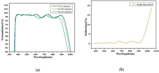 To increase light transmittance for better image quality, double coating AR glass was applied in CIS-WLCSP for automotive products. The transmittance and reflectance spectra of the AR glass are shown in Figure 11. The transmittance of the light with a wavelength of 420~900 nm was more than 97% with 0° and 20° incident angle as presented in Figure 11a. When the angle of incident light increased to 35°, the transmittance was still as high as 96.5% for light with a wavelength of 420~850 nm. With the increase in incident angle, only light with larger wavelength, which was out of the visible light spectrum, had an obvious transmittance loss. Meanwhile, the reflectance was lower than 1.5% for light with wavelength from 400 nm to 900 nm, as shown in Figure 11b.