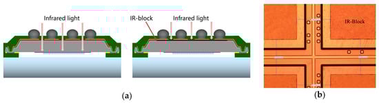 Compared with traditional COB packages, CIS-WLCSP was assembled based on a chip-unit without substrate, and the module was soldered on PCB directly. When infrared light interfered from the backside of the sensor module, it could penetrate the SMF, PA and Silicon into the diode area and mixed with the optical signals, resulting in ghost image issue. Such an issue was not acceptable for automotive application, based on security consideration. To solve this problem, a layer of metal Al, called an IR-block, was applied and the schematic is presented in Figure 12a.