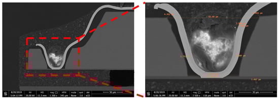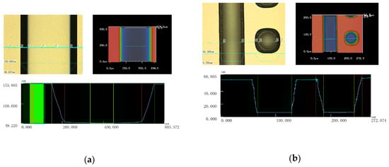 Since the second passivation layer was formed by a spray coating method, the shape of the silicon trench and via would impact PA thickness on the structure sidewall directly. To ensure the PA thickness for insulation, the angle of the trench was designed to 70°. After process optimization, the profile of the trench was controlled with straight and smooth form and without sharp angle and bowl shape in the top corner, as shown in Figure 13a. The top opening measured in the X direction and the depths of the trenches in five areas of the wafer are listed in Table 5. The spec for two items were 500 ± 20 μm and 100 ± 5 μm, respectively, which were achieved.
