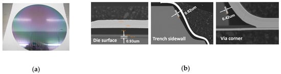 By the optimization of the PECVD process, the thickness uniformity in bare silicon wafer was higher than 98% and the step coverage in via corner for this trench-via structure was more than 30%. The outlook of the wafer after the PECVD process is shown in Figure 14a. The SEM cross-section images shown in Figure 14b presented that the thickness of the oxide was 0.93 μm, 0.92 μm and 0.42 μm in die surface, trench sidewall and via corner.