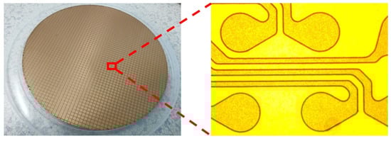 Firstly, 300 nm Ti and 500 nm Cu were deposited as the barrier and seed layer by PVD. Then electroplating was performed to increase Cu thickness to 3 μm. After lithography by spray coating, the RDL pattern was formed. Next, the redundant Cu and Ti seed layers without photoresist protection were removed by wet etching. The following process was photoresist removal and the electroless-plating of 3 μm nickel (Ni) and 100 nm gold (Au) on Cu RDL. The outlook of the wafer after electroless-plating Ni/Au is shown in Figure 16.