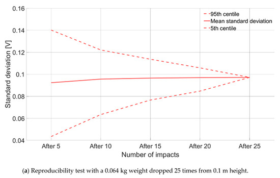 (a) Reproducibility test conducted in the VAW laboratory with a weight of 0.064 kg dropped 25 times from a 0.1 m height, the graph shows the standard deviation of maximum amplitudes as function of cumulative number of tests calculated in 5 million random combinations; (b) voltage associated to 10 impacts induced by a 0.064 kg weight dropped from a 0.1 m height. The maximum positive amplitude (V) is recorded for each impact.