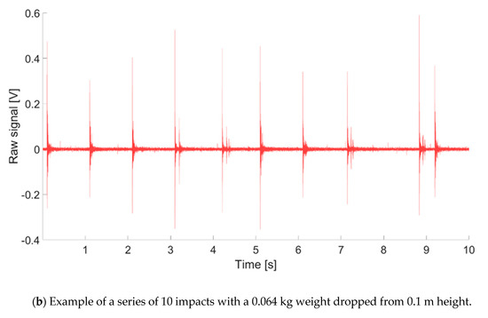 In a first phase of the experiment, a reproducibility test was conducted by impacting the laboratory plate with a medium weight mass—0.064 kg—dropped from a 0.1 m falling height, and repeating the same procedure 25 times. The maximum positive amplitude of the signal Amax (V) as defined by Wyss et al. [41] was recorded for each impact. The mean, standard deviation, 5th and 95th percentile of the experiment after k = 5, 10, 15, 20, and 25 impacts were calculated out of 5 million random combinations (k tests out of the total 25 tests). Results (Figure 2a) show that the standard deviation of the impacts stabilizes when the amount of impacts reaches ≈10. Based on this knowledge, we decided to repeat a same impact 10 times per category of weight-height to take into account the variability in energy transmission from the impacting weight to the plate through the hammer base when conducting the field experiment. An example of a given category of impact (in terms of weight and height) repeated 10 times, such as performed in the field, is presented in Figure 1b (here for a 0.064 kg weight dropped from a 0.1 m height).