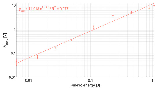 The calculation of the kinetic energy allows to investigate the relationship with the Amax recorded for each category of impact, which seems to be best expressed by a power law function, with an exponent slightly above 1 (Figure 3). In the laboratory, the experiment covers an energy field between 0.006 and 1 J, and Amax ranges between 0.04 and 10 V, which fits well the targeted range of amplitudes that is observed for natural bedload transport events in Alpine rivers equipped with the SPG system [38,40].