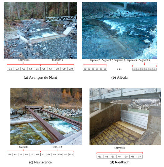 The four measuring stations where the impact experiment was conducted and the setup of the plates and segments: (a) at the Avançon de Nant (Western Swiss Alps), (b) at the Albula (Eastern Swiss Alps), (c) at the Naviscence (Southern Swiss Alps), and (d) at the Riedbach (Southern Swiss Alps). The numbers on the plates give the Swiss plate geophone (SPG) number. At the Albula, plates ‘A’ are accelerometer sensors, the others labelled G are SPGs. The numbering is made with view in the downstream flow direction at the Avançon de Nant and Riedbach measuring stations, and the upstream flow direction at the Albula and Naviscence measuring stations.