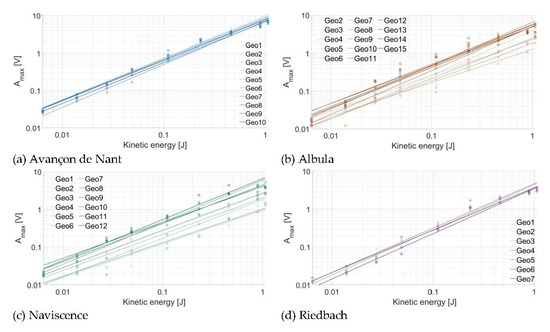 Relationship between the kinetic energy (J) of the impact and the associated Amax at (a) the Avançon de Nant, (b) the Albula, (c) the Naviscence, and (d) the Riedbach. Each point represents the (V) of the given drop category repeated 10 times.