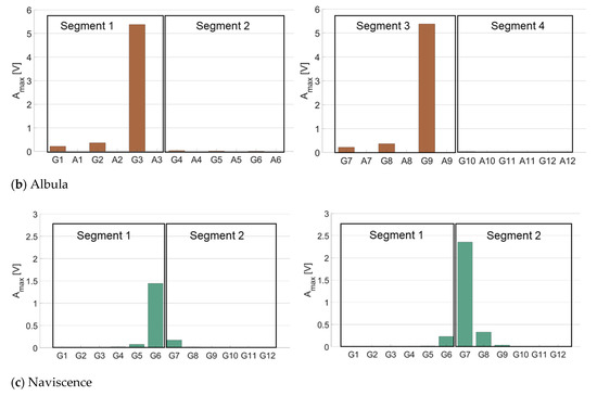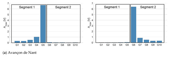 Results from Figure 6 illustrate that the energy tends to propagate to some extent from impacted plates towards non-impacted plates within a given segment, but poorly across different segments. This is notably true at the Avançon de Nant and Albula measuring stations (Figure 4a,b). For these two stations, the propagation of the signal was therefore quantified for the plates placed within the same segment. Depending on the position of an impacted plate within a segment (in the middle or at an edge), the Amax on the neighboring plates at 1–4 plates of distance was measured from a single plate, or as a mean between two plates. For instance, when impacting SPG 4 at the Avançon de Nant measuring station, there are two plates located at one plate of distance (SPGs 3 and 5), but only one located at two plates of distance (SPG 2) when considering the propagation of the energy within the same segment. In the first case, the Amax recorded at one plate of distance is calculated as the mean between the Amax of SPG 3 and SPG 5, while at two plates of distance it is computed as the Amax from SPG 2 only. At the Naviscence, the energy seems to also propagate across the different segments (Figure 6c), and only at this site the energy propagation was therefore also assessed across the two neighboring segments. For instance, the amount of propagated energy when impacting SPG 6 at the Naviscence was taken as the mean of SPG 5 and SPG 7, even if SPG 7 is installed into another segment.