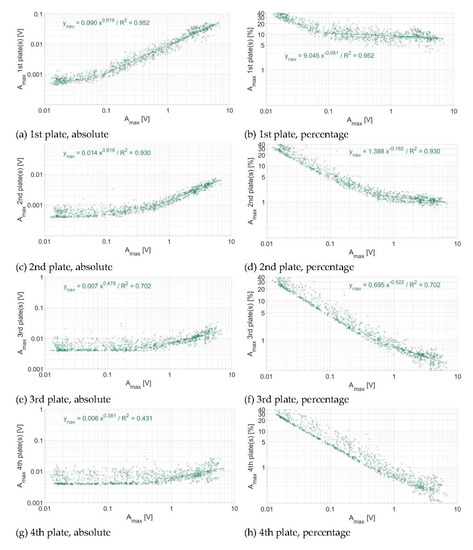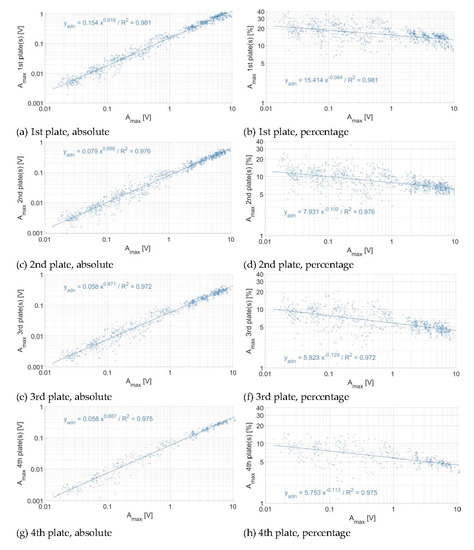 Energy propagation across plates at the Naviscence measuring station (a,b) at one plate of distance, (c,d) at two plates of distance, (e,f) at three plates of distance, and (g,h) at four plates of distance, in absolute (left column) and relative (right column) numbers. Each dot represents the voltage associated to a single impact. The regression is fitted only for maximum impact amplitudes greater than 0.08, 0.5, 1 V at one, two, three, and four plates of distance, respectively.