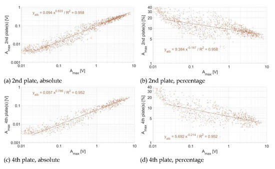 Energy propagation across plates at the Albula measuring station (a,b) at two plates of distance and (c,d) at four plates of distance, in absolute (left column) and relative (right column) numbers. Each dot represents the voltage associated to a single impact. The regression is fitted only for Amax greater than 0.02 V.
