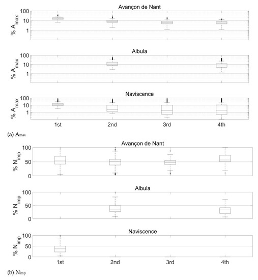 Percentage of (a) the impact Amax (note the logarithmic scale on the y-axis) and (b) Nimp (>0.1 V) recorded at one, two, three, and four plates of distance in all three investigated measuring stations. Boxplots show the 5th, 25th, 50th, 75th, and 95th percentiles of the distribution, outliers are marked with crosses. Note that Amax covers a range of impacts between 0.01 and 10 V, while Nimp (-) only considers the impacts greater than 0.1 V. At the Albula, there is no data available at one and three plates of distance, because there are accelerometers mounted below each second plate. At the Navisence, no impulses are detected further than one plate of distance.