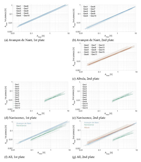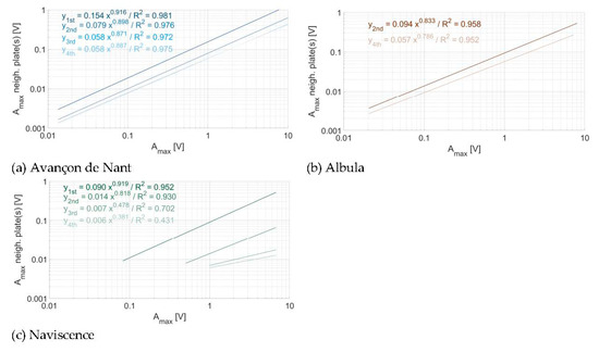 As observed in Figure 7, Figure 8 and Figure 9, there is an attenuation of the propagated energy across plates with distance from the impacted plate when considering the Amax. In Figure 11, the regression equations between the impact Amax and the propagated Amax across plates were fitted for all the impacts on every plate taken together for a given impact distance (i.e., one, two, three, or four plates of distance) and at a given site. At the Avançon de Nant, there is a significant attenuation of energy propagation between one and two plates of distance (factor 2), then smoother between two and three plates of distance (factor 0.5), then there is no more attenuation between three and four plates of distance. At the Albula, the attenuation between two and four plates of distance is moderate (factor 1/3–2/3). At the Naviscence, the attenuation is substantial between one and two plates of distance, about a factor 2.5 for impacts of 0.5 V to a factor 8.5 for impacts close to 10 V. Then the attenuation decays between two, three, and four plates of distance (to a factor 2–3), but the remaining propagated energy is very low.