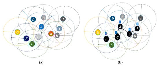 In the beginning, in Algorithm 1, to guarantee the minimum hops starting from sink node to farthest node in the network, sink node has perfect awareness of the network topology and utilizes the breadth-first search (BFS) [27] algorithm to determine the level of every node in the network (Algorithm 1, Line 5). As a result of BFS, we have a tree-based network consisting of levels. Each level,, has a set of nodes, . The optimal aim is to find the minimum number of connected reference nodes. In fact, finding a minimum number of reference nodes is a non-deterministic polynomial-time (NP)-hard problem [4,26]. Specifically, its time complexity is , where is the number of nodes in each level. In this article, our target is finding a simple approximation algorithm to find the minimum set of reference nodes, , that cover all nodes in the next level, . At the end of the initial step, the following steps are sequentially conducted.