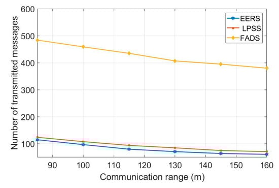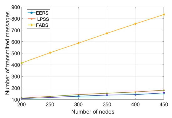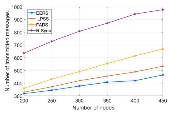 Experimental results reveal that EERS improves energy consumption in a small test network. To further validate EERS, we developed a simulator that conducts the algorithms of EERS, LPSS, and FADS. Meanwhile, the simulation results of R-Sync were adopted from [6]. Simulations were developed in MATLAB using wireless networks of various sizes, and different transmission ranges. We presumed there are sensor nodes which are randomly distributed in a square area of 1000 m 1000 m. We also assumed that all nodes are identical and independent. Key simulation parameters are summarized in Table 3. In fact, we adopted most of the simulation parameters from [6]. We believe the simulation parameters is an appropriate choice to simulate realistic scenarios. By variation of the transmission range, we could simulate many types of sensor nodes which have different wireless ranges. For example, Arduino Nano RF has up to 100 m radius, which is located between 85 and 160 m (simulation range). On the other hand, changing the number of nodes in the network allowed us to demonstrate the behavior of our protocol in the sparse network (200 nodes) up to the dense network (450 nodes). We focused on the number of transmitted messages and the time of the process to show the performance of EERS. To reduce the impact of random errors, we ran 10,000 cycles for each experiment and obtained their average value. To illustrate the effect of the position of the sink node on the simulation results, two positions of sink node were tested: (1) sink node located at the center of the network; and (2) sink node located at the corner of the network. As expected, there is no big difference in the results due to the uniform distribution of the nodes. Therefore, to avoid redundancy, we only report the results in which the sink node was located at the center of the network.