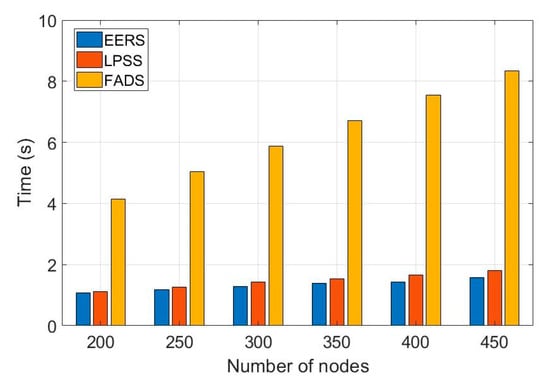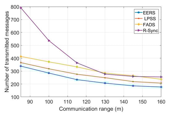 First, we evaluate the performance of all protocols (i.e., EERS, LPSS, FADS, and R-Sync) under transmission ranges from 85 to 160 m. Figure 4 shows the number of transmitted messages at the reference node scheduling process while Figure 5 shows the time of the whole process. For a network with the transmission range of 160 m, EERS, LPSS, and FADS generate 61, 71, and 380 messages, respectively. EERS outperforms LPSS and FADS by factors of 1.2 and 6.3, respectively. On the other hand, EER can decrease the time of the scheduling process to around 14% and 84% compared to LPSS and FADS, respectively, as shown in Figure 5. In the synchronization process. EERS has considerably fewer messages than LPSS, FADS, and R-Sync, as depicted in Figure 6. EERS outperforms LPSS, FADS, and R-Sync by factors of 1.17, 1.34, and 1.44, respectively. Next, we evaluate the performance of EERS, LPSS, FADS, and R-Sync over various network sizes from 200 to 450 nodes. Figure 7 shows the number of transmitted messages at the reference node scheduling process. For a large network with 450 nodes, EERS, LPSS, and FADS generate 157, 180, and 834 messages, respectively. EERS outperforms LPSS and FADS by factors of 1.15 and 5.3, respectively. On the other hand, EER can decrease the time of the scheduling process to around 13% and 81% compared to LPSS and FADS, respectively, as shown in Figure 8. In the synchronization process, for a large network with 450 nodes, EERS has considerably fewer messages than LPSS, FADS, and R-Sync, as depicted in Figure 9. EERS outperforms LPSS, FADS, and R-Sync by factors of 1.15, 1.4, and 2.1, respectively.