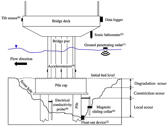 A wide range of techniques have been developed in the last few decades for monitoring bridge scour (see e.g., Prendergast and Gavin [] for a state-of-the-art review). Many of these techniques provide a direct measurement of the scour depth at a bridge pier, whereas other techniques provide information on the effects of scour on the bridge. Table 1 reports the most widespread techniques with relevant references, and Figure 1 illustrates a bridge pier equipped with some of these sensors.