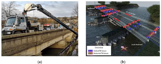 Despite the development of such a wide range of sensors, practical applications aiming to monitor real-time bridge scour are very limited because of accessibility issues under flood events, damage, their cost and their inherent imprecision. However, there are few examples of use of scour monitoring systems, particularly in the UK, a country whose bridges have been affected significantly by scour in recent years [,] and where the use of scour sensors is increasing fast. Among these, it is worth mentioning the “BridgeCat technology” [], consisting of a vehicle featuring a hydraulic arm equipped with a mechanical scanning sonar, a high-resolution camera, and a digital altimeter measuring height off the riverbed (Figure 2a), the network of tilt sensors for detecting structure movement caused by scour in Lamington Viaduct [] (Figure 2b), and the vibration-based scour detection system deployed for five months at the Baildon bridge in Bradford, UK [].