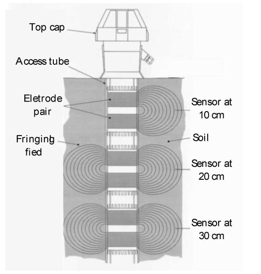 - Sentek Technologies. Factory literature for the EnviroSCAN; Sentek Pty. Ltd.: Kent Town, South Australia, 1995. [Google Scholar]