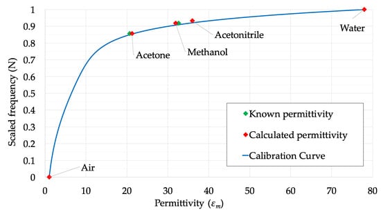 The scaled frequency readings of the probe were plotted in a graph against the values of the permittivity of the considered chemicals and the following analytical relationship was fitted [], consisting of a quadratic and an exponential factor: