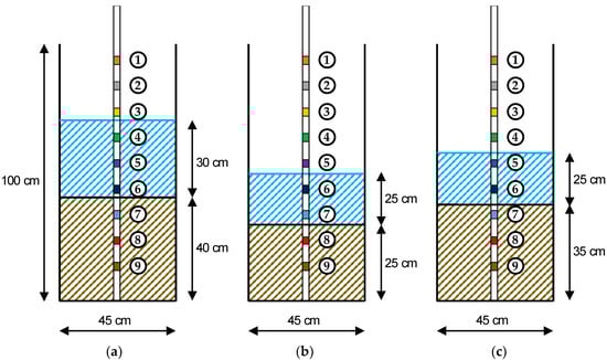 - The soil was saturated with fresh water, and the tank was filled with 30 cm of water above the sand surface to simulate a static soil–water interface, such as the riverbed condition (Figure 9a).