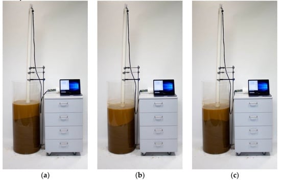 A “static” scour test was performed in order to mimic probe functioning in a real-case scour scenario. Figure 9 shows the test setup used to record the probe response during a simulated scour event and the following deposition phase. The probe, equipped with nine electromagnetic sensors, was placed in the middle of a custom made cylindrical acrylic tank with diameter and height of 45 cm and 100 cm respectively. The initial setup consisted of three sensors in each medium, i.e., soil, water and air (Figure 9). The soil used for the experiment was silica sand, with a particle size of 1 mm.