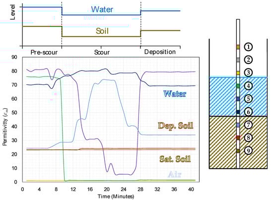 Figure 11 illustrates the time history of the permittivity values recorded during the test by the nine sensors in the probe. The values of permittivity shown in Figure 7 allows for identifying four bands in the plot, separating the sensor reading associated to the permittivity of water (εm = 70–80), saturated soil (εm = 23–30), deposited soil (εm = 30–38) and air (εm = 1). The scouring and deposition process did not affect sensors 1, 2 and 3 because they were in air for the duration of the whole test. This is confirmed by the value of the permittivity near one maintained throughout the experiment. Similarly, sensors 8 and 9 recorded a constant value of permittivity of approximately 23, i.e., the value of εm associated with saturated soil.
