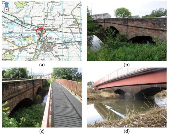 (a) Location of the A76 200 Bridge; (b) Side view of the A76 200 Bridge; (c) The pedestrian bridge; (d) Side view of the two bridges.