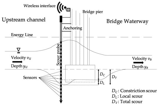 Current practice for assessing the scour risk of bridges relies on visual inspections at regular intervals, which can involve the use of scuba divers. During an extreme weather event, transport operators make the decision to close the bridge to traffic by visually comparing the water level with a fixed flood level marker [,] as it is not possible to carry out underwater inspections due to safety issues. Visual inspections are generally expensive, time-consuming, and the outcomes are often subjective, depending on the inspector’s experience. Furthermore, using the water level only to trigger decisions ensures that the bridge is not inundated or possibly struck with floating debris while open to traffic, but it does not allow for the direct control of scour risk under floods with return periods, other than the one considered for defining the fixed flood level marker.