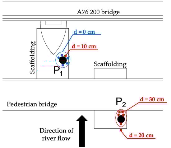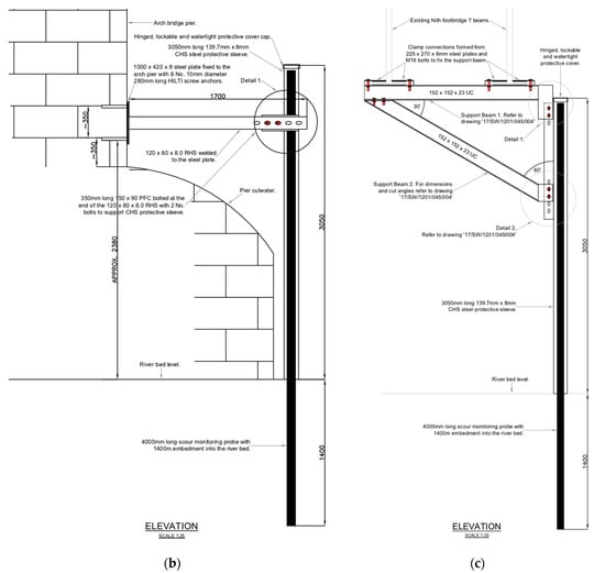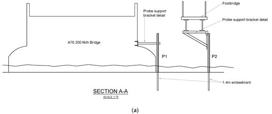 One probe (P1) is installed on the upstream face of a pier of the A76 200 bridge to detect total scour, whereas the other (P2) is installed in the centre of the river to detect degradation and contraction scour, and is connected to the pedestrian bridge (Figure 14). Figure 15 shows the details of the connections between the two probes and the bridges, ensuring their stability during a flood event.